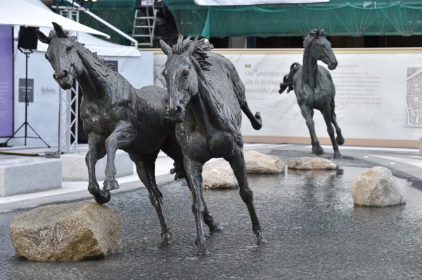 Six bronze horses created by the British sculptor Hamish Mackie were unveiled on 25 June, 2015 galloping through an extraordinary new public square at Goodman’s Fields in Aldgate. A large crowd descended on E1 to witness the spectacle including friends of the sculptor, owners of the equine muses and many of the the craftsmen and women who had worked on this incredible project.