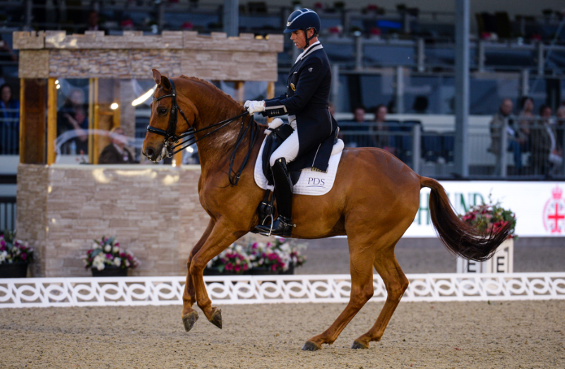It was a British one, two, three in the International FEI Dressage Grand Prix supported by Horse & Hound at Royal Windsor Horse Show. British maestro Carl Hester led the winning trio, taking a comfortable first place with Barolo, a compact chestnut Hanoverian, standing barely more than 16hh, almost 8 inches shorter than Carl’s last Windsor winner, Nip Tuck in 2015. It was a first competitive outing for Carl and Barolo, who has been ridden to date by joint owner Charlotte Dujardin. Carl and Barolo gained over 74% in the 12 string class.