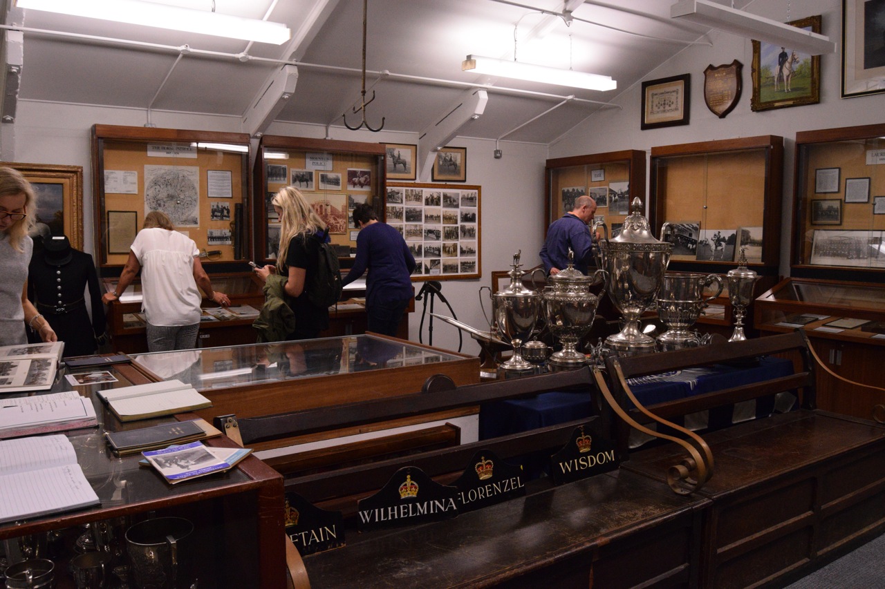The City Saddles group also enjoyed looking round a small museum of memorabilia including uniform from days gone by as well as modern equipment, stable plaques of the Queens horses and photographs and medals of famous police horses. Horse and police equipment is constantly modified to protect both animals and officers, visors are now worn and can deflect lasers, chains are added in addition to leather reins to make them more robust.