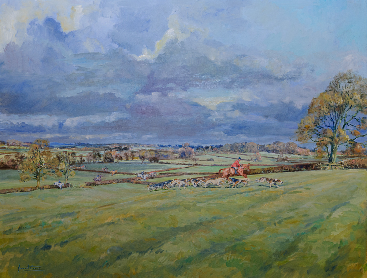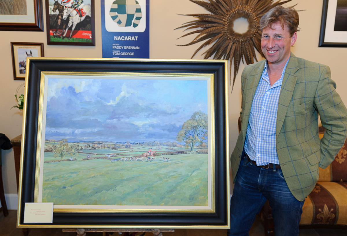 The painting, entitled, “With land in trust, the fields remain. Two hundred years, our sport retained (away from Peat Moss)”, depicts the current Meynell and South Staffordshire Huntsman Jamie Nicklin and hounds hunting across Meynell country, but was specifically painted to be a timeless image which could be representative of any era in the hunt’s 200-year history.