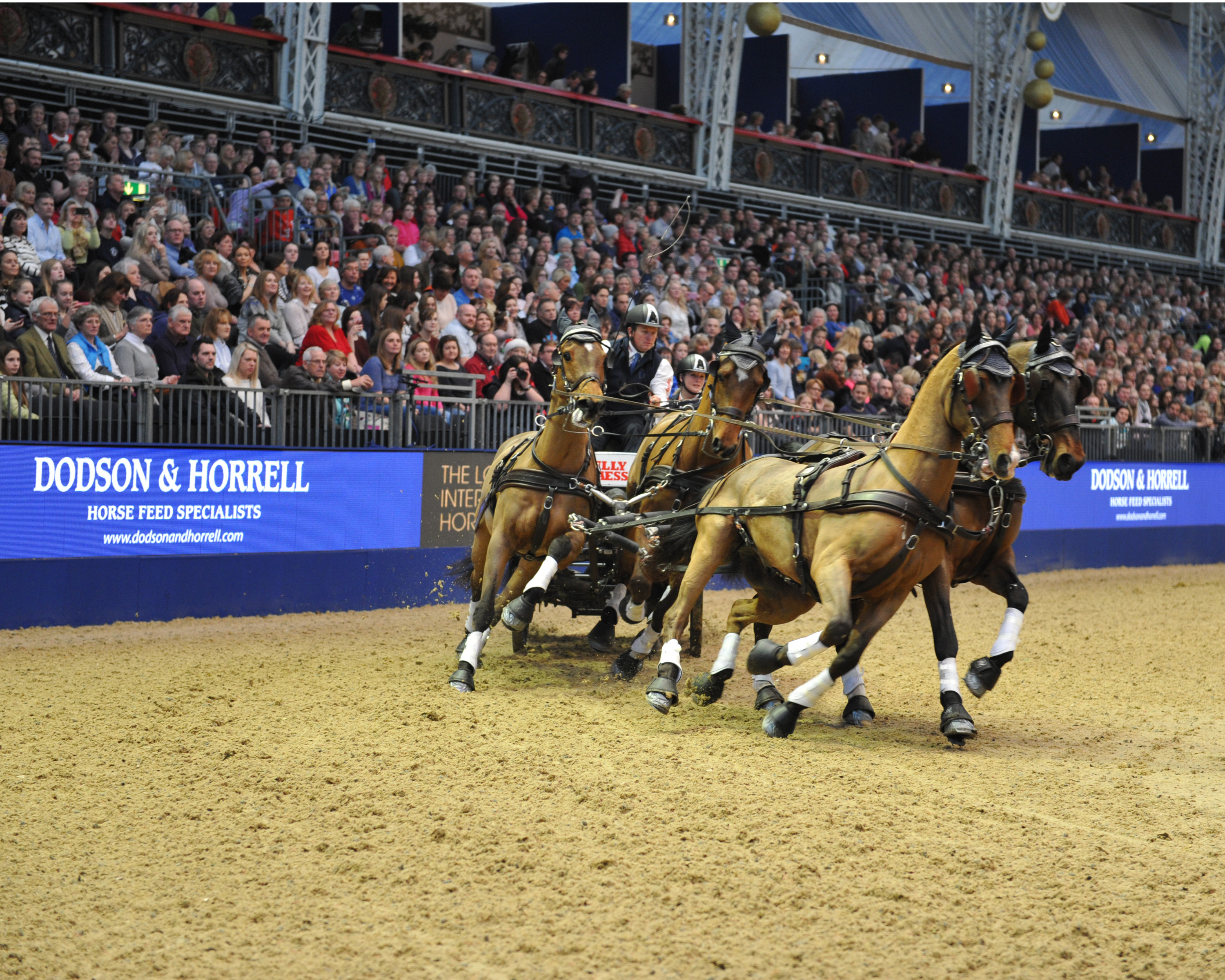 International event rider Pippa Funnell appeared in a new guise – as groom/navigator on the back of a carriage pulled by a pony from the World Horse Welfare, Olympia’s Charity of the Year.