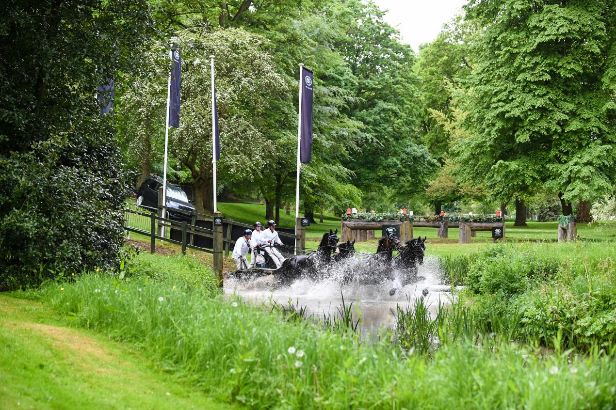 In horse four-in-hands, the leader – reigning world champion and winner here eight times – Boyd Exell (AUS) drove surely and confidently in wet conditions, recording the fastest time in five of the obstacles. He won this section and increased his lead to an impressive 20-penalties. His closest challenger at this time is Belgium’s Edouard Simonet whose careful marathon – he was third in the phase – moved him into second place overall, from fifth after the dressage. Father and son competitors from the Netherlands – Ijsbrand and Bram Chardon, the latter competing in horse four-in-hands for the first time here, moved up the leader board to take third and fourth places respectively, less than one penalty separating them.